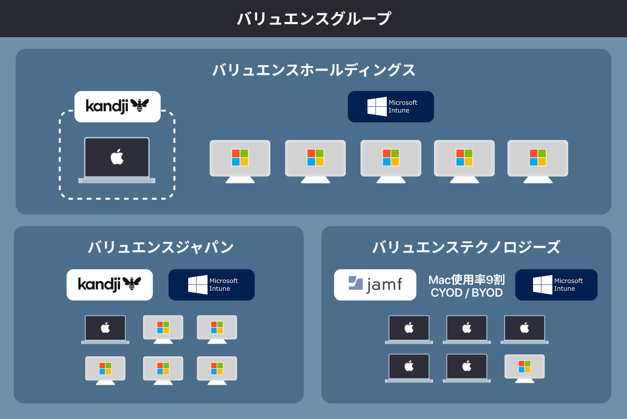 VTの環境整備後、コーポレートIT部はバリュエンスホールディングス(以下、VH)およびバリュエンスジャパン(以下、VJ)のITインフラの強化にも乗り出しました。しかし、ほとんどの従業員が開発エンジニアであり、かつ業務委託かつフルリモートで働くVTとは異なり、VHやVJは従業員のオフィス・店舗への出社を基本とする一般的な働き方です。MDM未導入という点は変わらなかったものの、業務用端末は1,000台を超えるWindows PCが全体の9割以上を占め、従業員選択制も採用していません。