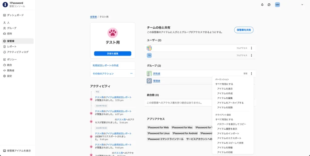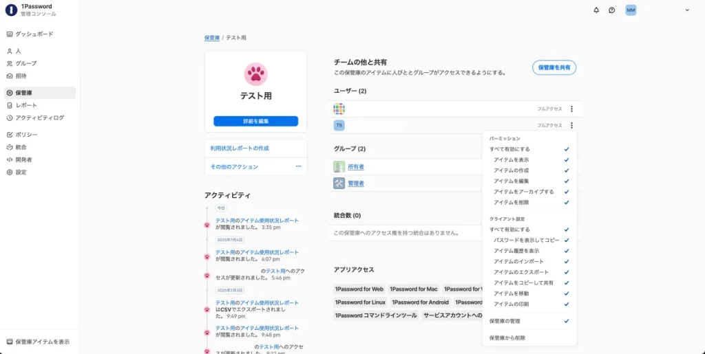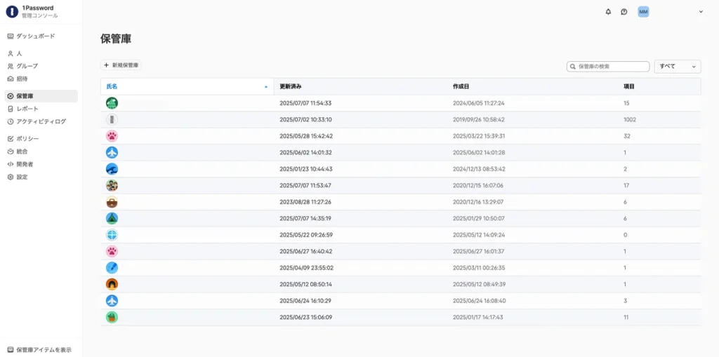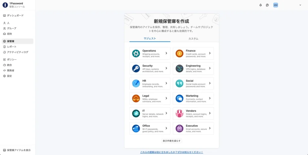 保管庫を作成・共有・管理することで、チームメンバーが重要な情報を整理し、必要なアイテムにアクセスしやすくなります。誰がどの情報にアクセスできるかを細かく制御できるため、管理者は会社の情報を安全に保ちつつ、チームにとってスムーズで効率的な環境を整えることができます。