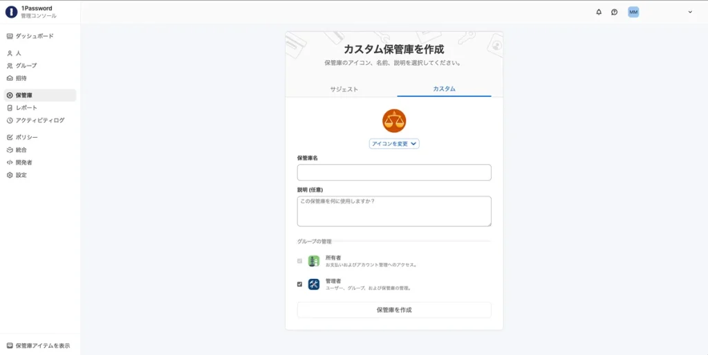- グループの管理を選択(管理者はデフォルトで保管庫を管理できます。このオプションを外すと、保管庫へのアクセス権限はオーナーのみに制限されます。)
