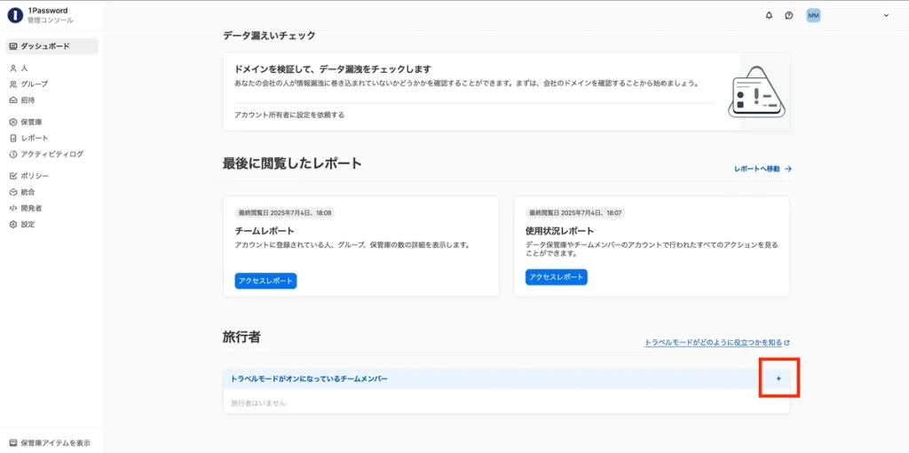 - 管理コンソールの下部「旅行者」で「+」をクリック