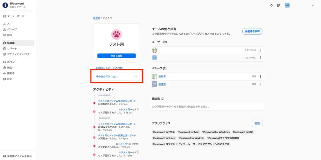 - 実行されたアクション(パスワードのコピー、アイテムの編集、保管庫へのアイテムの作成など)