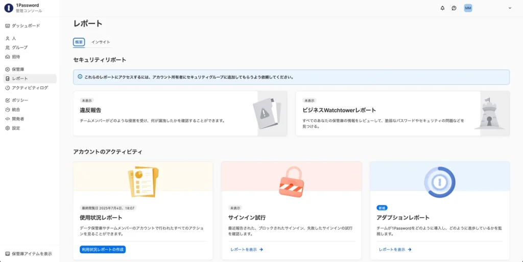 1Password Business の管理者は、チームによる保管庫の利用状況やセキュリティ関連のアクティビティを確認するためレポートを作成できます。