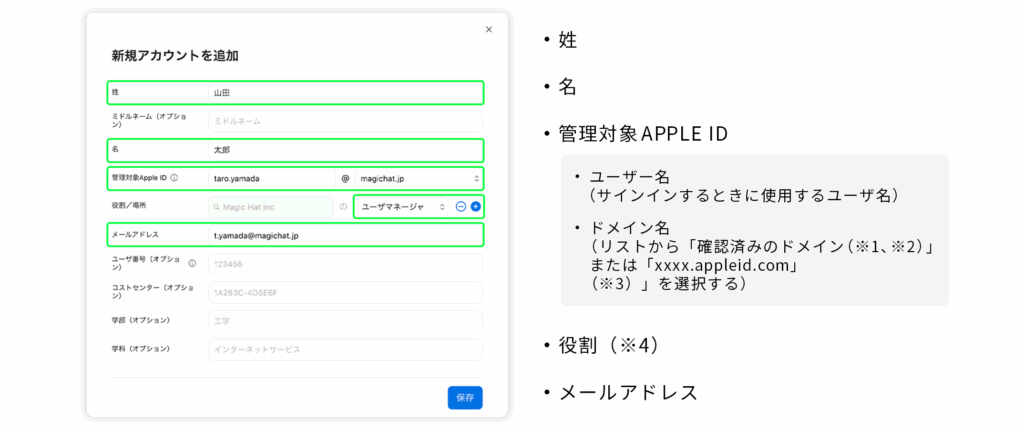 - ドメイン名: (リストから「確認済みのドメイン (※1, ※2)」 または「xxxx.appleid.com」 (※3)」を選択する)
