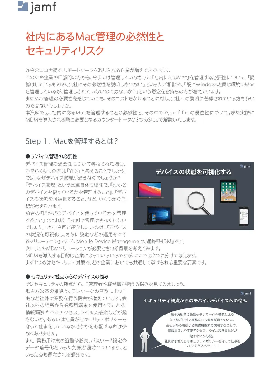 関係部署と端末管理方針・スケジュールを共有・合意を得るようにします。 もし、 Mac や MDM 導入の合意に向けての説得材料に不安がありましたら、以下ホワイトペーパーを参考にすると良いでしょう。