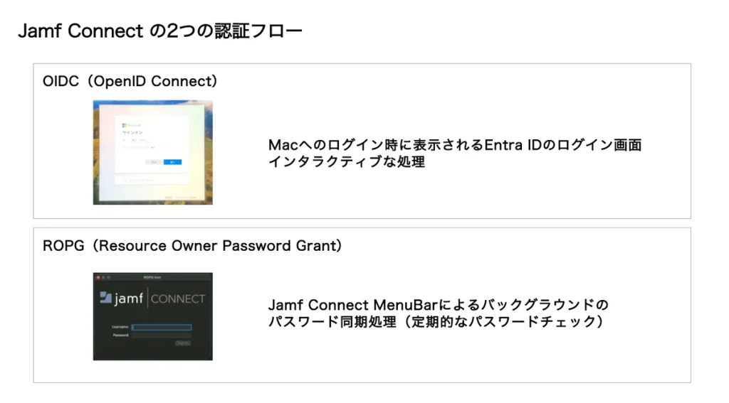Jamf Connect には、OIDC(OpenID Connect)とROPG(Resource Owner Password Grant)の2つの認証フローがあり、それぞれに対して対応が必要です。
