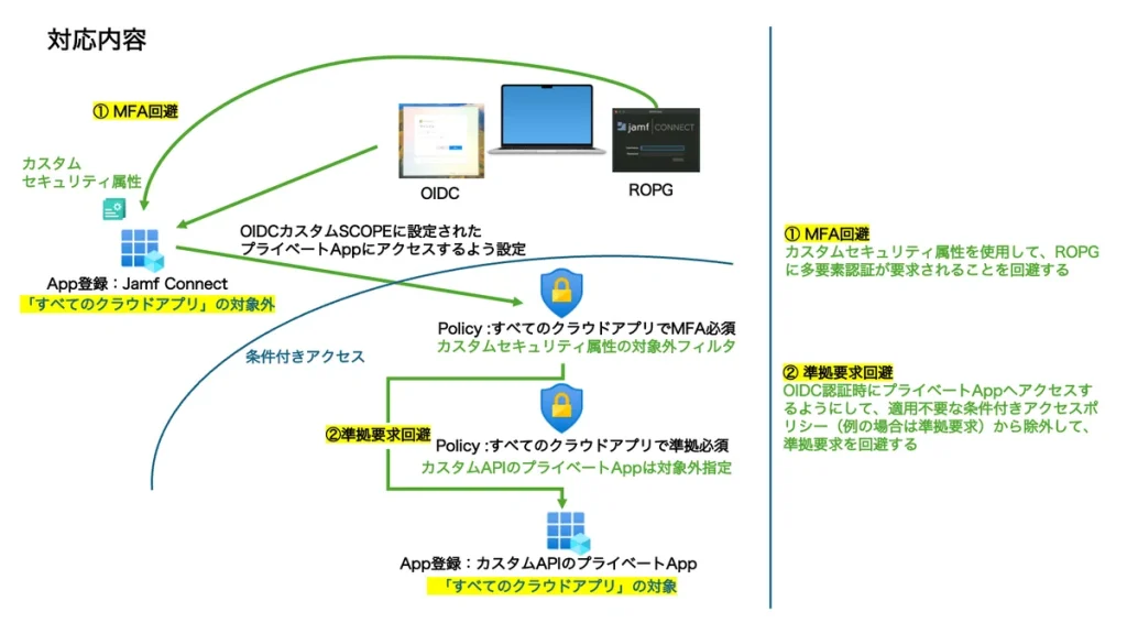 Jamf Connect アプリへのOIDCフローを担当するカスタムAPIのプライベートアプリ(クラウドアプリとして指定可能)を用意し、この例の場合、必要な条件付きアクセスポリシー(MFA必須)は適用しつつ、不要な条件付きアクセスポリシー(準拠必須)からは対象外にします。