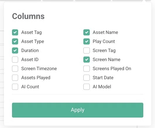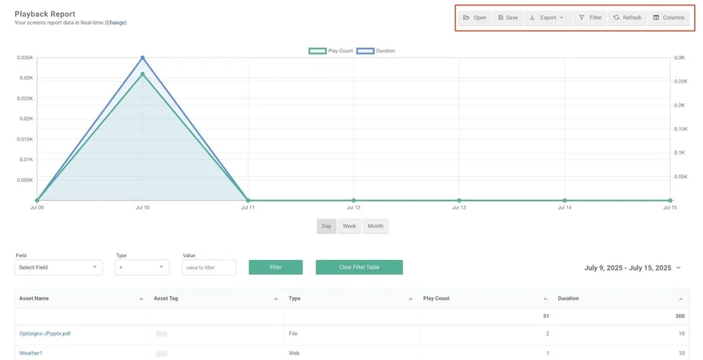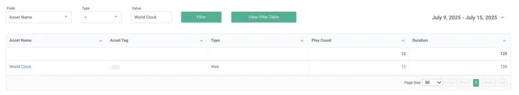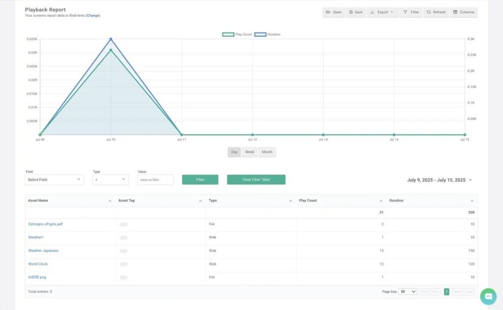 また、OptiSigns では日付範囲でのフィルタリングが可能です。例えば「特定の日・週・月に、特定のスクリーンでどのコンテンツが再生されていたか」を確認できます。これはキャンペーン効果を追跡する際に特に便利です。アセット名やタグで絞り込むことで、広告がどこで、何回再生されたかを確認することもできます。