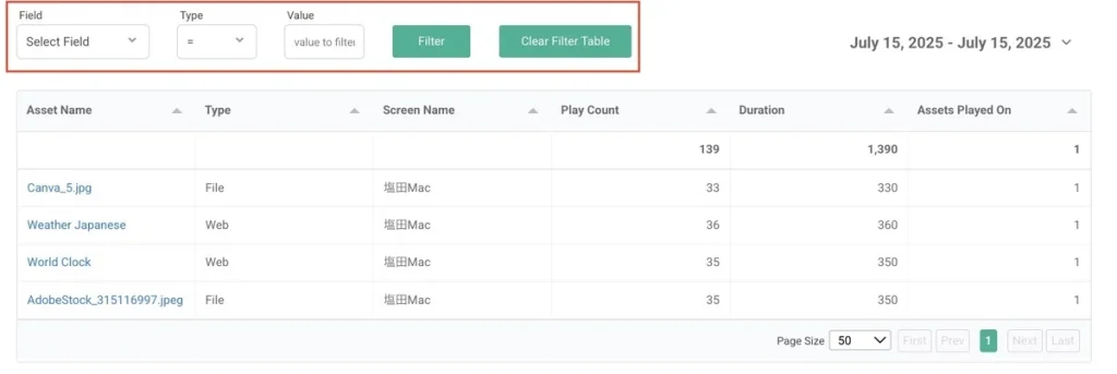 • Filter: 日付範囲、アセットタグ、スクリーンタグなどでデータを絞り込み