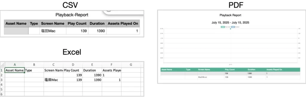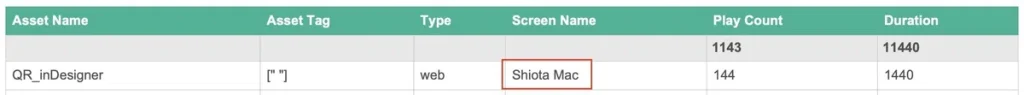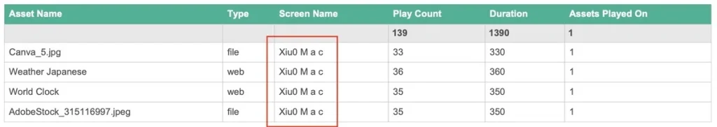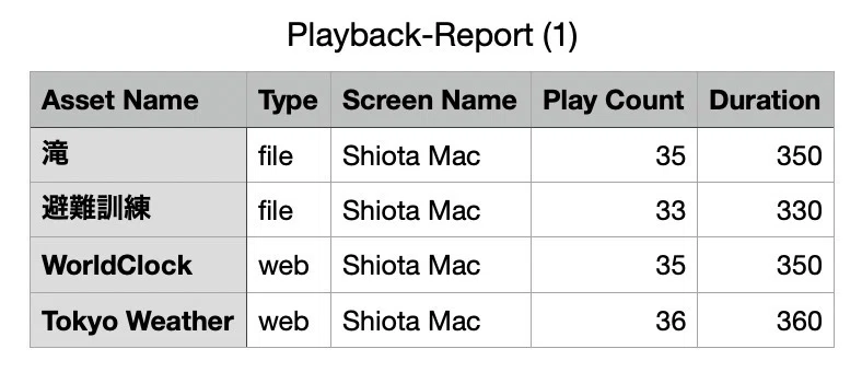 再生レポートでは、組織内のすべてのスクリーンと再生されているコンテンツの状況を一目で把握できます。各レポートには、アセット名、アセットの種類、スクリーン名などの情報を含めることができ、ビジネスニーズに合わせて柔軟に活用できます。