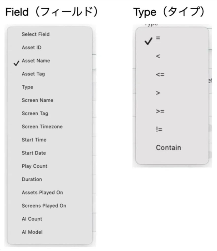 • Field: 絞り込みたいデータの種類を選択