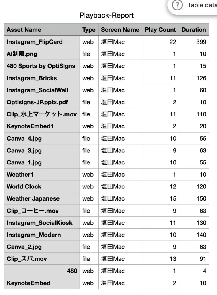 OptiSigns の Proof-Of-Play レポート(再生レポート)は、管理者やユーザーが各画面が正しく動作しているかを、ひと目で、そしてリアルタイムで確認できる便利なツールです。各画面の再生データが自動的に記録・集計され、レポートとしてまとめられます。レポートには、画面の設置場所、再生時間、コンテンツの種類、表示時間などの詳細情報が含まれます。