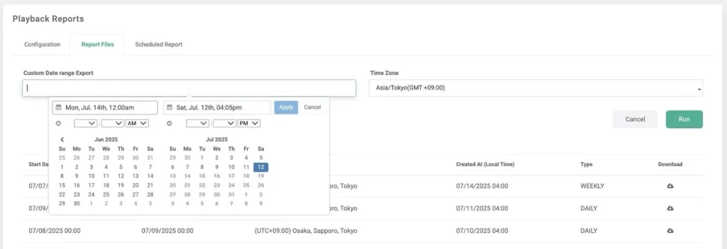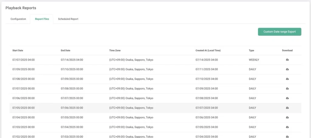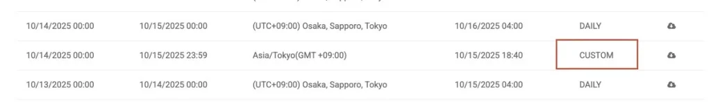 角生成レポートには、実行タイミング、タイムゾーン、実行日時、と種類(毎日、毎週、毎月など)が表示されます。ここから各レポートを直接ダウンロードすることも可能です。