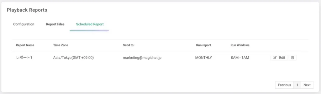 レポート名、タイムゾーン、送信先メールアドレス、実行タイミング(毎日、毎週、毎月)、実行時間帯を確認できます。「Edit」ボタンから設定内容を変更できま、不要なレポートは削除することも可能です。
