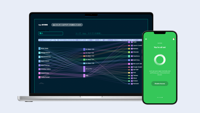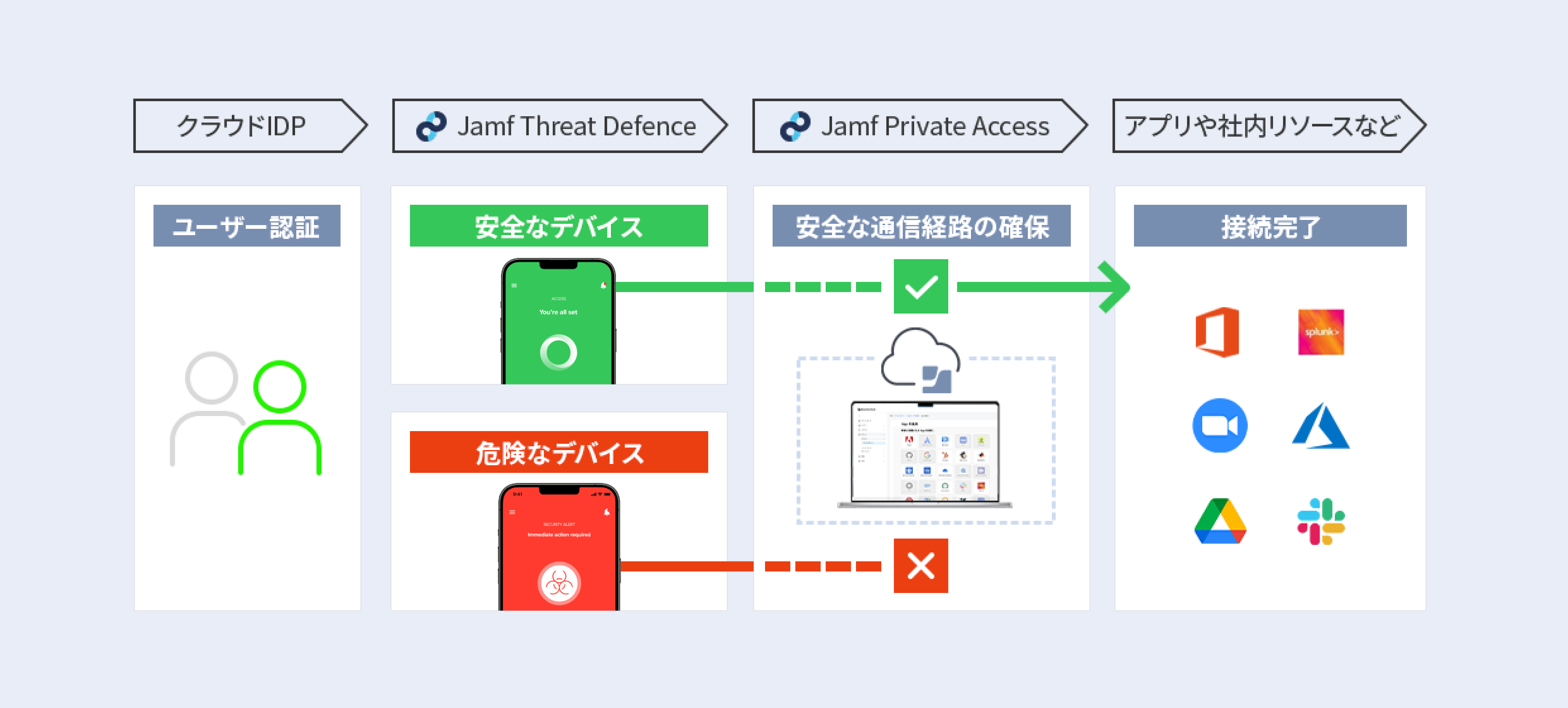 Jamf Private Access 経由のデバイス以外、業務アプリ等への接続を拒否。事前に各デバイスに対して使用させるアプリをJamf Private Accessで定義。企業が許可したデバイスかつ安全なデバイスのみが業務アプリに接続できます。